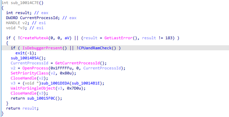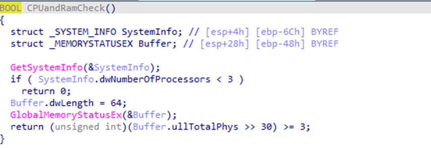 | Defense Evasion | T1497.001 | Virtualization/Sandbox Evasion: System Checks | APT Loader | Checks CPU core configuration and RAM before proceeding. |
