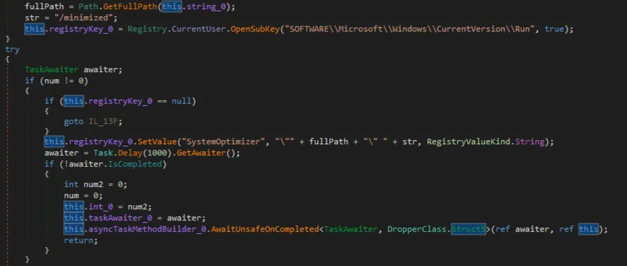 | Persistence | T1547.001 | Boot or Logon Autostart Execution: Registry Run Keys / Startup Folder | Dropper | Adds the SystemOptimizer key in the registry HKCU\SOFTWARE\Microsoft\Windows\CurrentVersion\Run. |