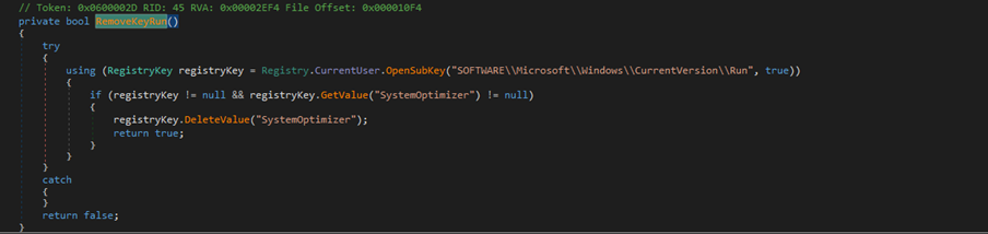 | Defense Evasion | T1070.009 | Indicator Removal: Clear Persistence | Dropper | Deletes the SystemOptimizer key in the registry HKCU\SOFTWARE\Microsoft\Windows\CurrentVersion\Run. |