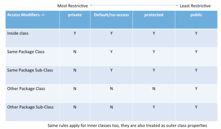 Nếu một thành viên trong lớp không được khai báo với bất kỳ access modifier nào, thì nó sẽ được xem là có default access. Quy tắc truy cập đối với default access tương tự như với lớp: thành viên đó chỉ có thể được truy cập bởi các lớp trong cùng một package. Kiểu truy cập này bị giới hạn nhiều hơn public và protected, nhưng ít bị hạn chế hơn private. (Ít tiếp cận nhất): private < default < protected < public (Dễ tiếp cận nhất) Bảng dưới đây sẽ tóm tắt các access modifiers ở trên khi xét đến các lớp trong cùng package, khác package, và các lớp con.