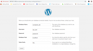 Điền vào biểu mẫu như hình với các thông tin mà bạn đã chỉ định khi tạo cơ sở dữ liệu WordPress trong MariaDB. Hãy để trống các trường “Database Host” (thường là localhost) và “Table Prefix” (nếu bạn không có nhu cầu đặc biệt), sau đó nhấn nút ‘Submit’.