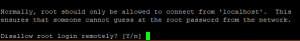 - Tiếp theo, không cho phép đăng nhập root từ xa để ngăn chặn tin tặc truy cập vào cơ sở dữ liệu của bạn. Tuy nhiên, vì mục đích thử nghiệm, bạn có thể muốn cho phép đăng nhập từ xa nếu bạn đang cấu hình máy chủ ảo