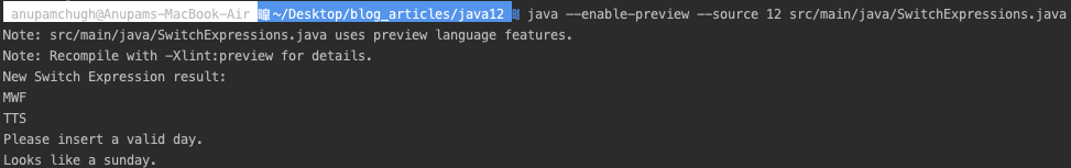 javac -Xlint:preview --enable-preview -source 12 src/main/java/SwitchExpressions.java