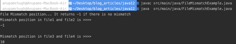 System.out.println("File Mismatch position... It returns -1 if there is no mismatch");