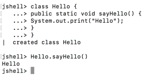 Chúng ta cũng có thể định nghĩa và thực thi các class methods trong Java REPL shell.