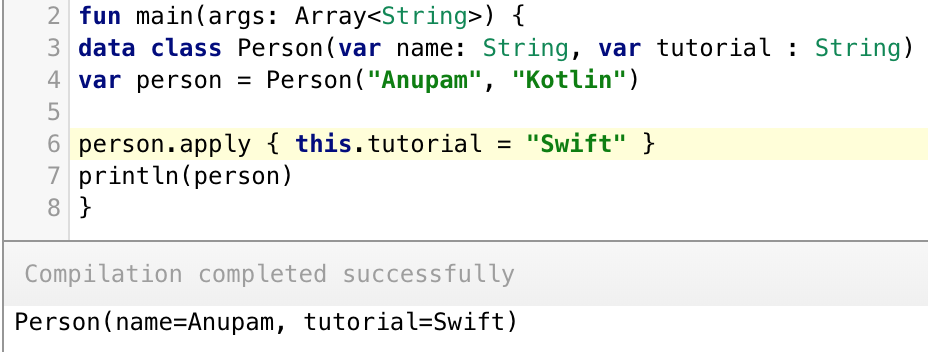 println(person) // Prints: Person(name=No Name, tutorial=Kotlin tutorials)
