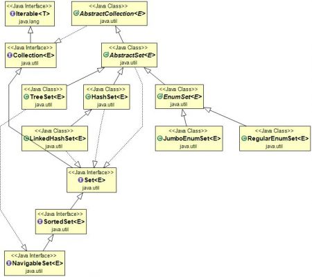 Interface Set trong Java kế thừa từ interface Collection. Interface Collection lại kế thừa từ interface Iterable. Một số lớp cài đặt (implementation class) thường dùng của Set bao gồm: HashSet, LinkedHashSet, TreeSet, CopyOnWriteArraySet và ConcurrentSkipListSet.